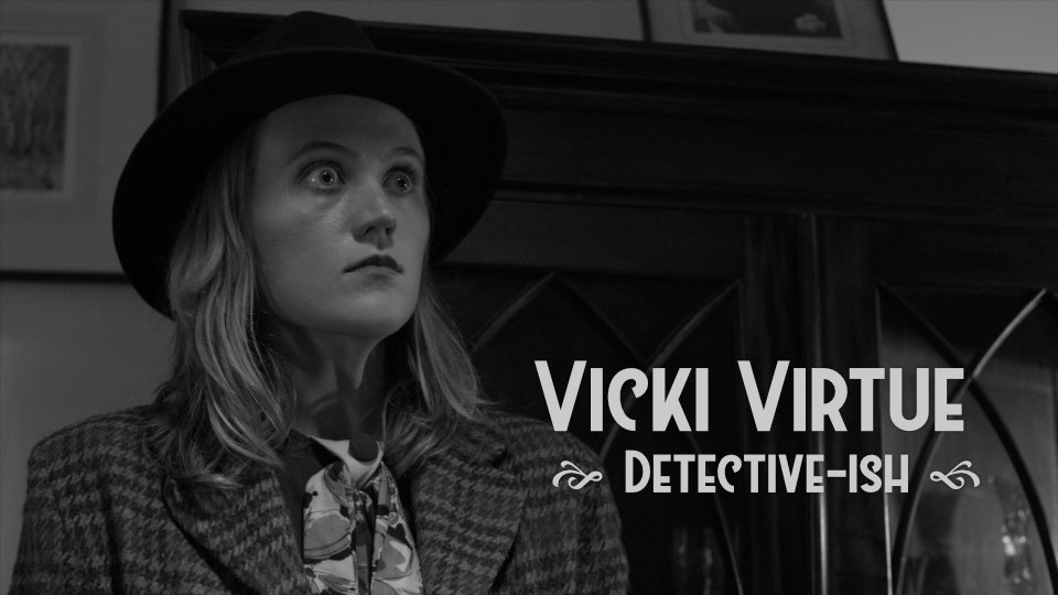 Our film follows a young woman named Vicki Virtue, an inexperienced private investigator who is certain she can handle the Norwood investigation on her own, without her father's help. When he shows up, and refuses to leave, she finds his experience is as helpful to her as her self-restraint is to him. Together they handle a greedy widow, a mad scientist, a snooty butler and... did we mention a vicious murder?