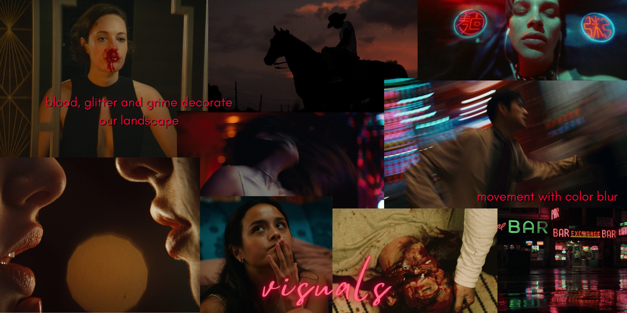 Romantically lit, modern Los Angeles Western—anamorphic or shot digitally with vintage glass—using splashes of color in a dark bar to contrast idealism against external violence. Glittery cowboy hats slash through a mundane backdrop, creating nostalgia inside a contemporary dating landscape. The film embraces messiness and disorientation, where violence carries a strange beauty—two women, faces bloody, laughing together. I want the viewer to feel like they are there with their own eyes - all the human error with it.