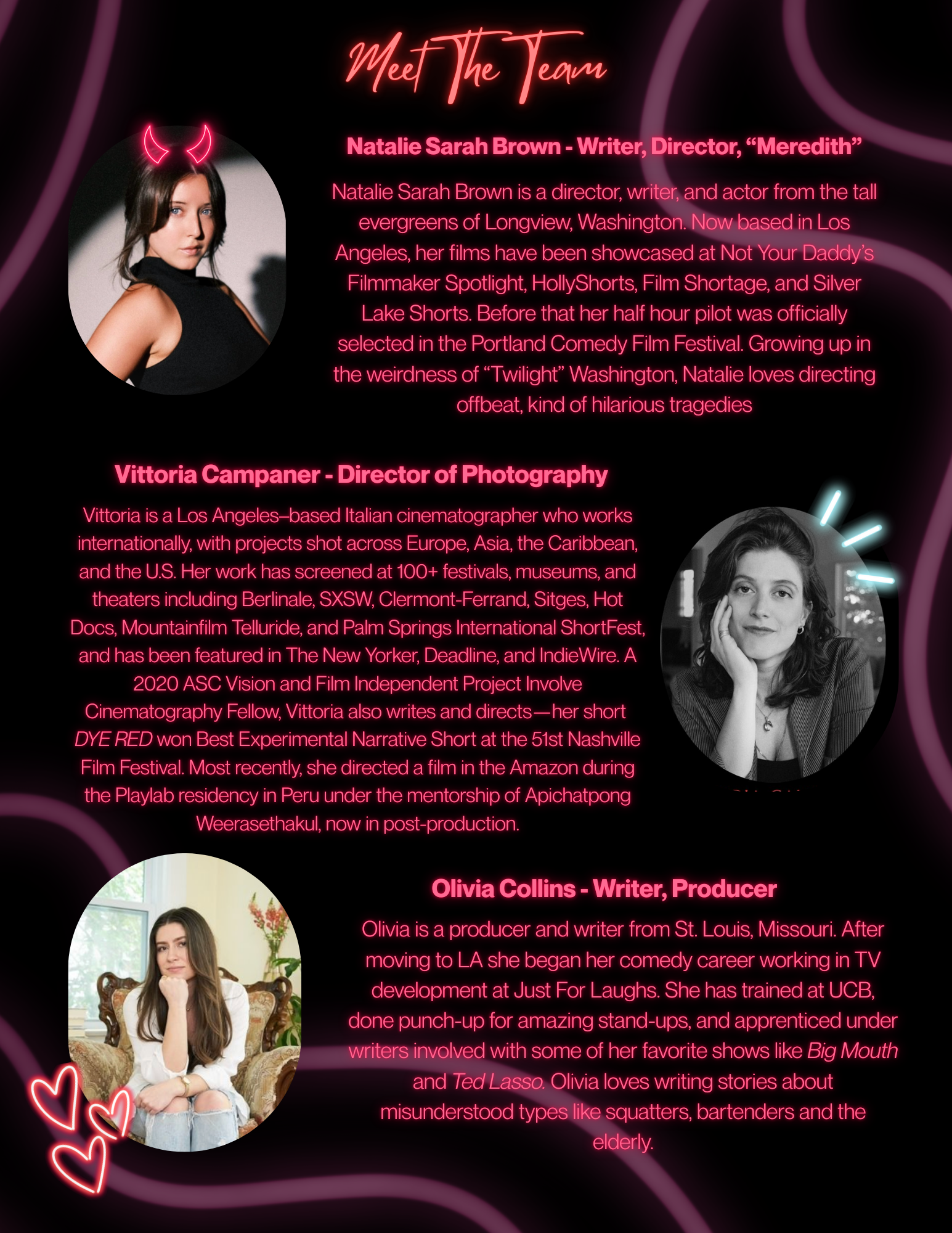 "I've been drawn to camp, commentary, and dark comedy as a lens to tell relational stories about young women's lives. Similar to John Grady Cole's arc of betrayal and rage in Cormac McCarthy's All the Pretty Horses, Meredith will learn her own version of betrayal and disappointment. She will walk alone at the end of the film, accepting a difficult new perspective. This is based on a true story - the bar fight happened, and I felt small and powerless. This film is about reclaiming agency in the aftermath. "