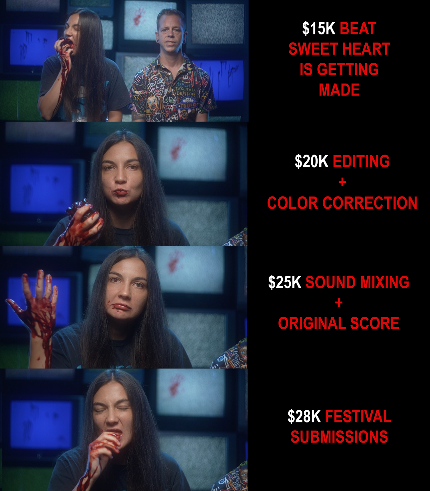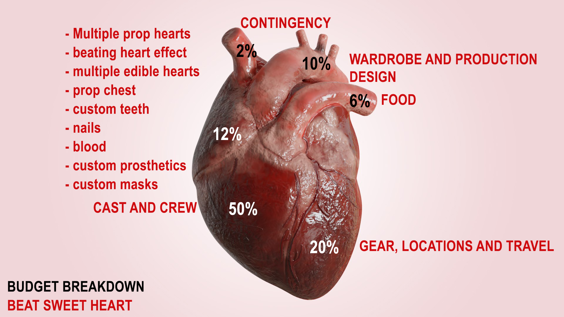 Our crowdfunding goal is $15,000 which we'll use for cast, crew, locations, edible hearts, travel, custom masks, teeth and prosthetics etc. Check out Beat Sweet Heart budget breakdown.