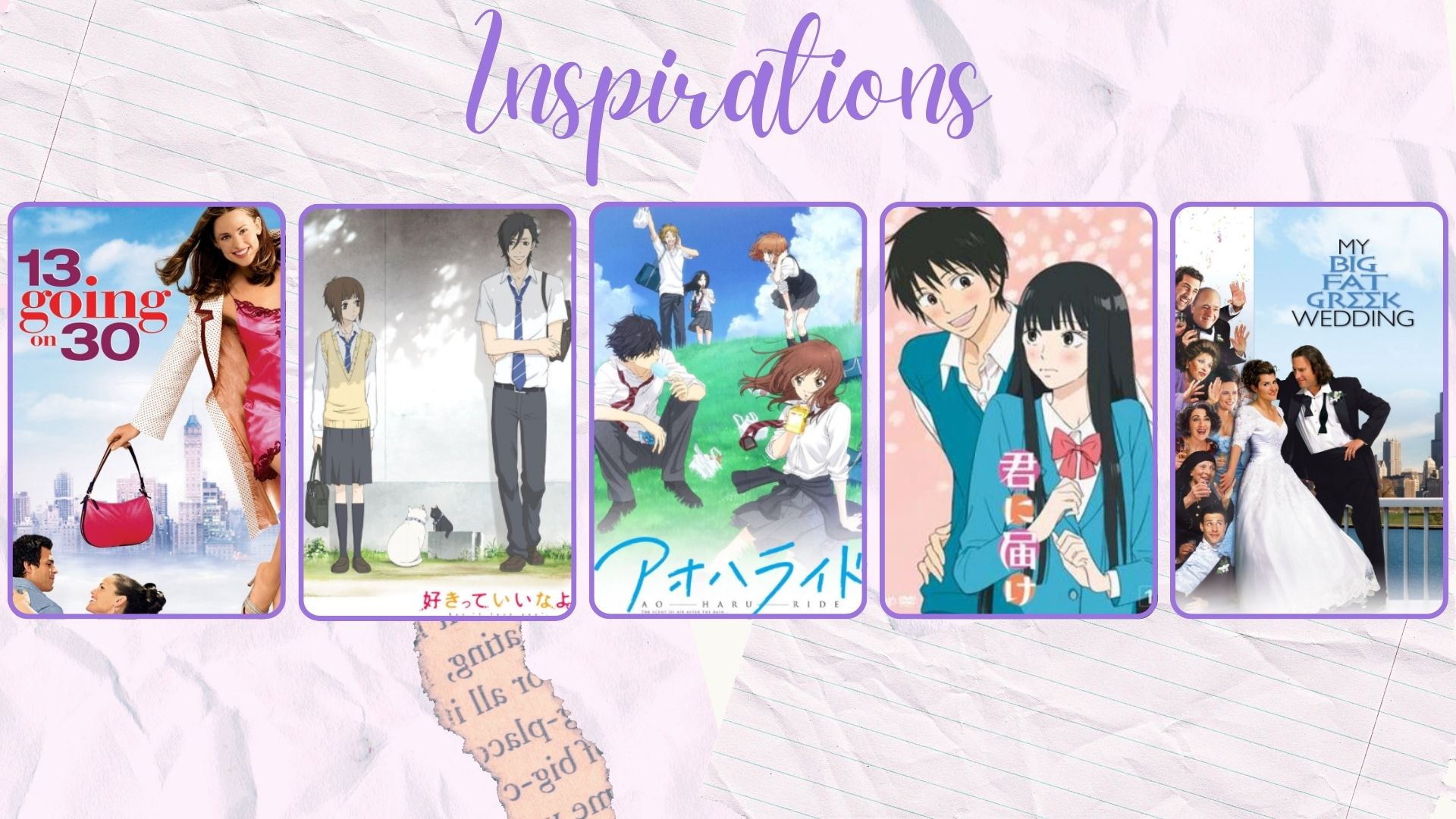 Drawing inspiration from 13 Going on 30, teen romance anime (Kimi ni Todoke, Say I Love You, Ao Haru Ride), and My Big Fat Greek Wedding which captures the warmth, whimsicality, and emotional sincerity of the characters and their world. However, visually I want to merge the styling of Coppola’s soft lighting, pastel tones, and introspective framing with Gerwig’s colorful nostalgia, playful symmetry, and practical textures.