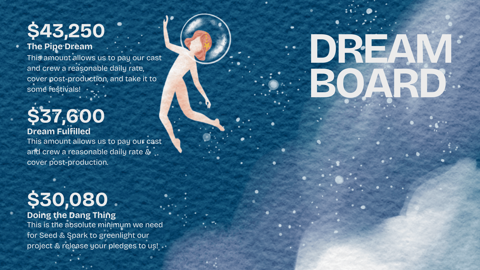 $43,250 The Pipe Dream — This amount allows us to pay our cast and crew a reasonable daily rate, cover post-production, festivals, and distribution.