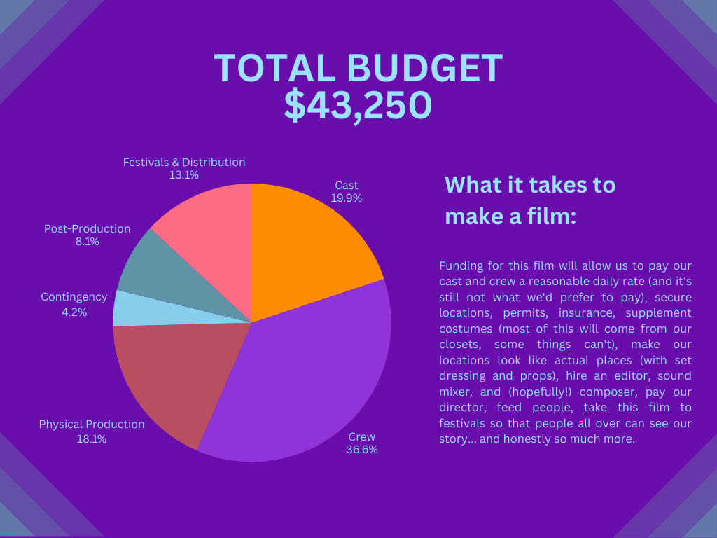 Even if our project weren't governed by SAG-AFTRA minimums, we are governed by a moral code that doesn't believe in asking people to do their work for free. Funding for this film will allow us to pay our cast and crew a reasonable daily rate (and it's still not what we'd prefer to pay), secure locations, permits, insurance, supplement costumes (most of this will come from our closets, some things can't), make our locations look like actual places (with set dressing and props), hire an editor, sound mixer, and (hopefully!) composer, pay our director, feed people, take this film to festivals so that people all over can see our story... and honestly so much more.