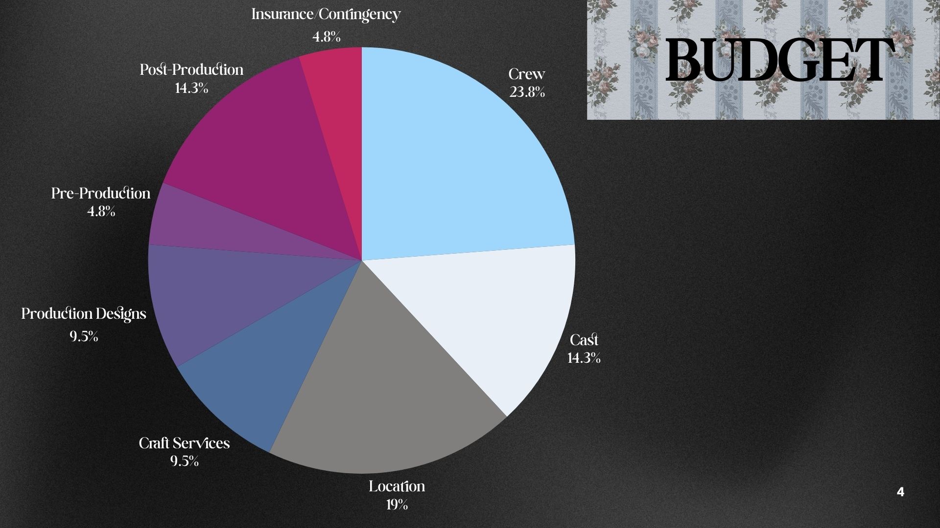 - Production costs, such as location, craft services, set, and wardrobe designs.