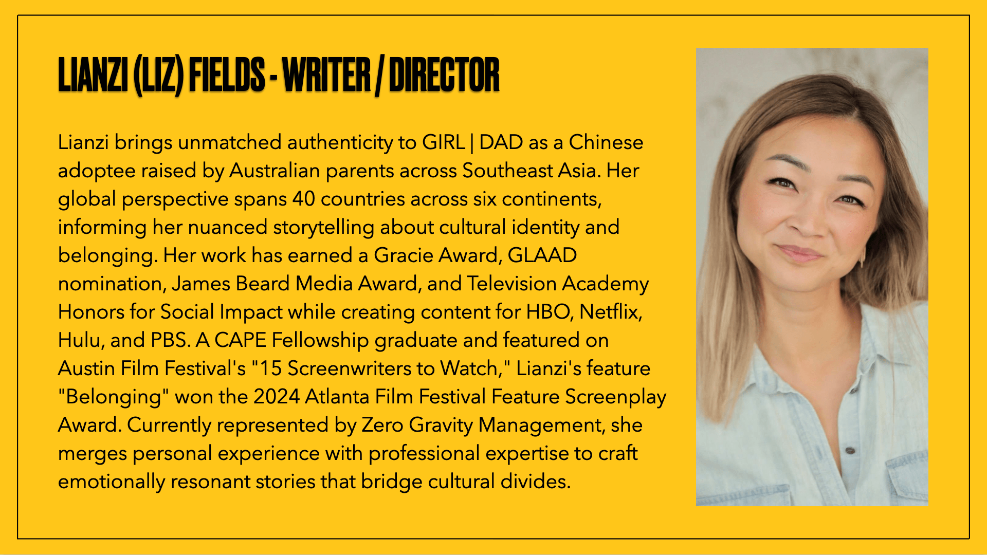 Lianzi (Liz) Fields is an Asian-Australian-American writer and filmmaker who has lived in and traveled to 40 different countries across six continents. A Chinese adoptee raised by Australians in South East Asia, Liz has spent her life chasing stories that highlight the complex emotions surrounding cultural displacement and characters seeking their identity, no matter the cost.