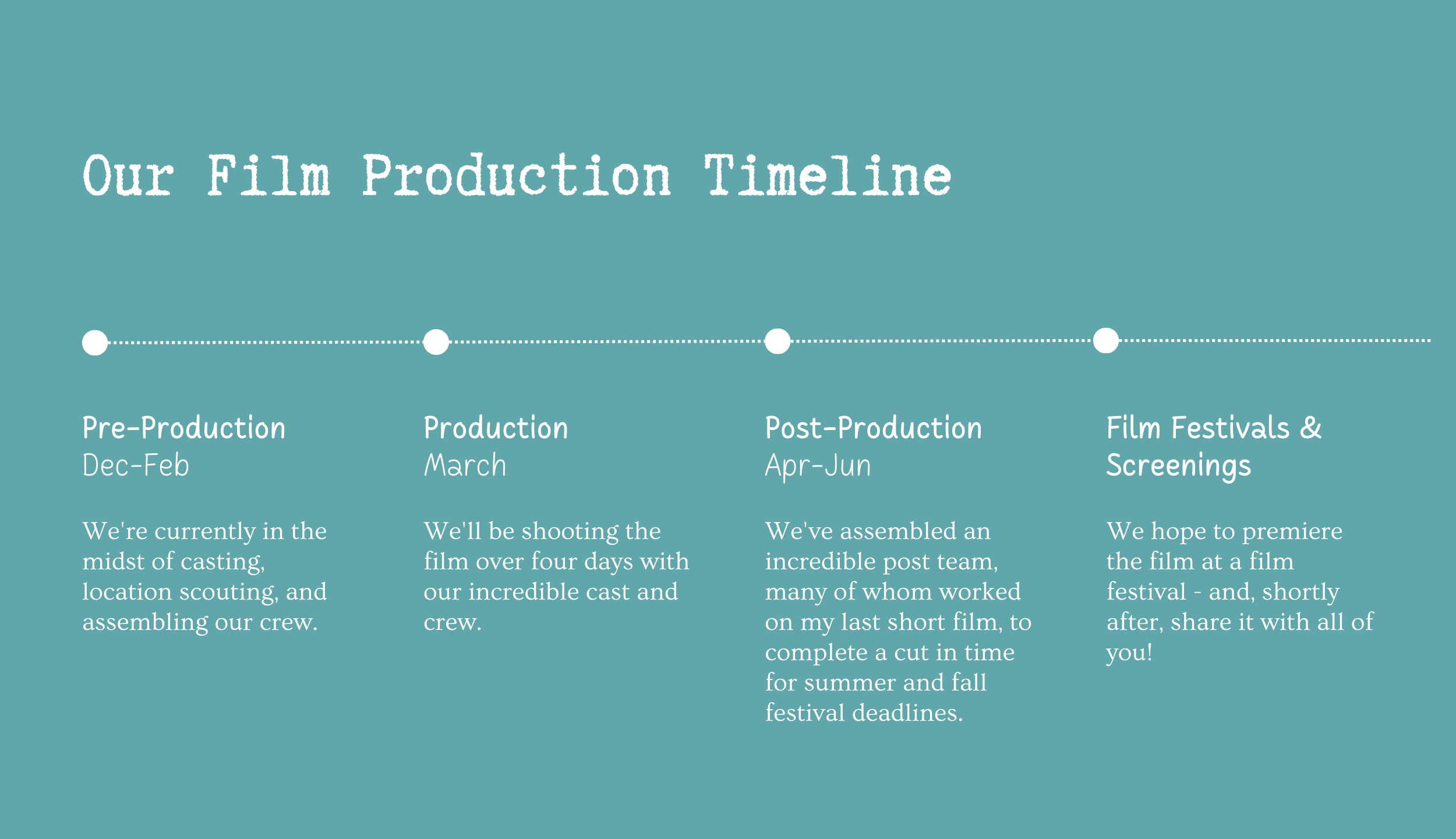 Our total production budget is projected to land between $17,000-$18,000, and we are fundraising $10,000 of that total through this campaign.