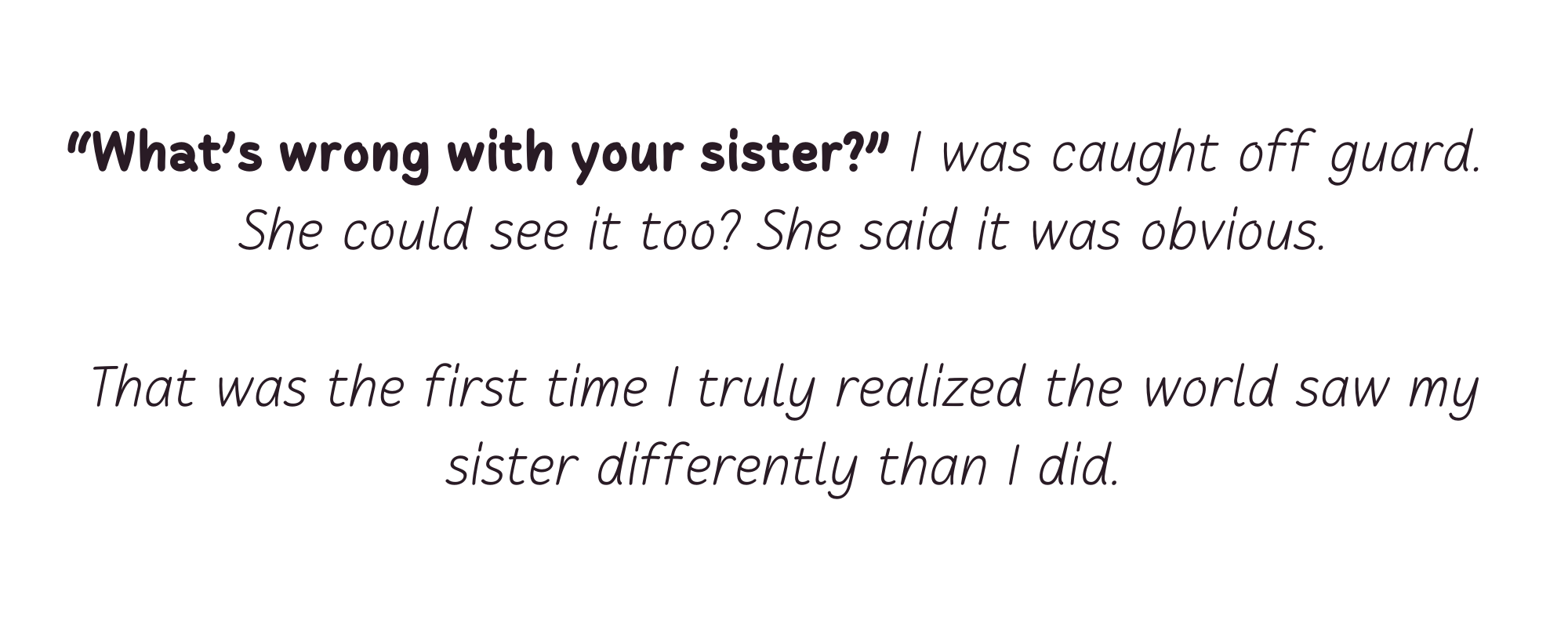 I remember this moment very clearly. It was a normal Saturday morning at the synagogue I attended every weekend. I loved it there–the kosher cookies, my friends, the comfort of routine. Synagogue was a second home. I was about nine years old, standing in the bathroom with a friend I’d known forever when she suddenly asked me, “What’s wrong with your sister?” I was caught off guard. She could see it too? She said it was obvious. That was the first time I truly realized the world saw my sister differently than I did. Up until then, she was just my sister, but in that instant, she became “my sister with autism.” It was a quiet, private shattering. Growing up, I was met with questions like that all the time, from peers, from adults, sometimes well-meaning, sometimes cruel. And as much as I loved my sister, I couldn’t shake the shame I felt, both for being ashamed and for wishing things were different. All I wanted was to fit in, to have my crush like me back, to not stand out. Now, in 2025, I see that moment with clarity. My peers weren’t malicious–they were kids. They didn’t know better. But that moment stayed with me, and as I searched for a story to tell for my advanced film, I kept coming back to it. This short film is my attempt to condense that feeling into a short film–to capture the innocence, the confusion, the tenderness, and the quiet devastation of that first realization. It is a love letter to my sister, to my younger self, and to anyone who has ever felt torn between the people they love and the world they long to be part of.”