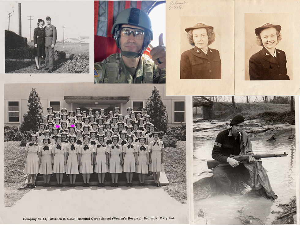Photos of Cheryl's family members taken during military service: Mom, Dad, Aunt, Husband, Grandson