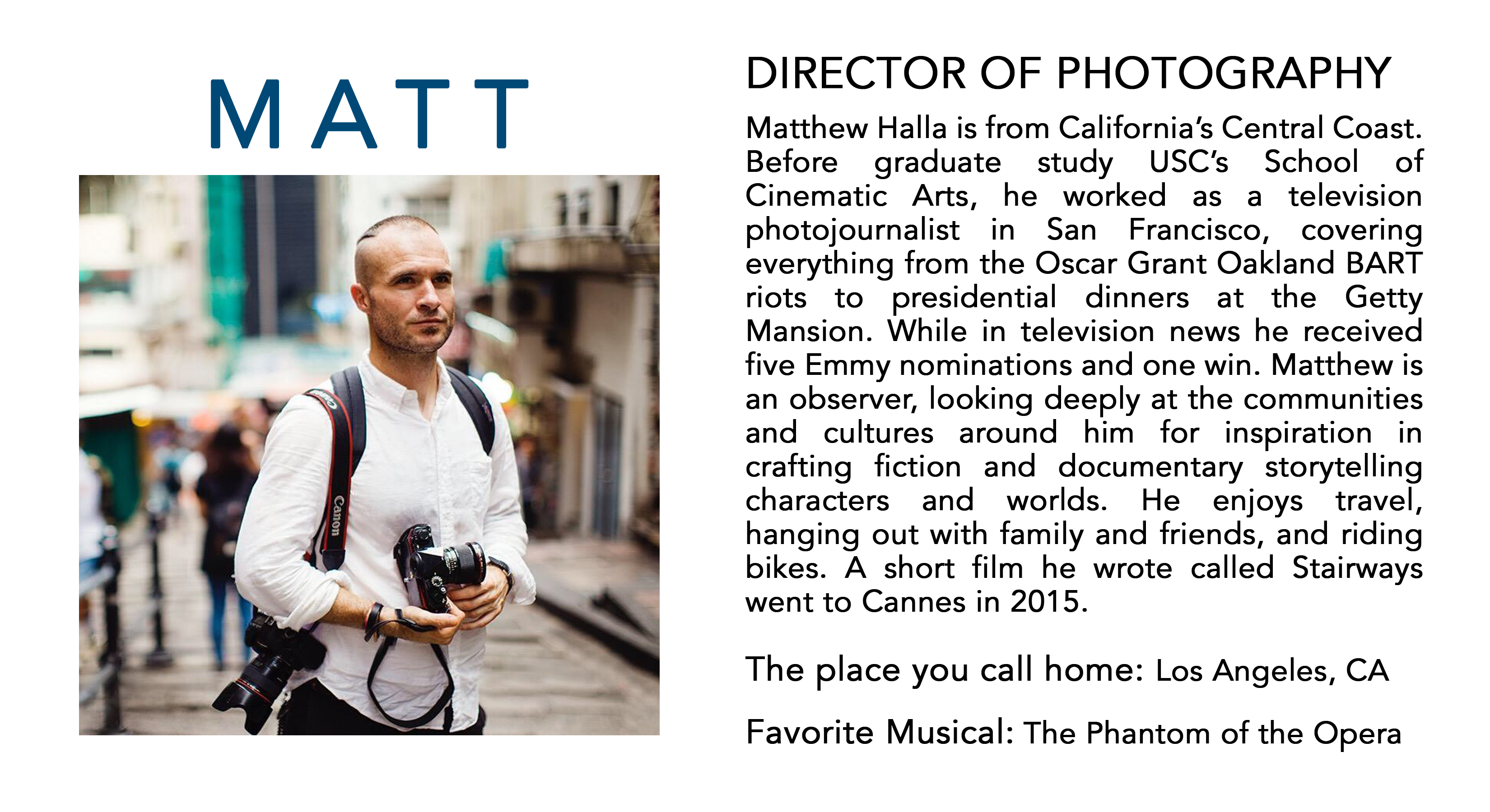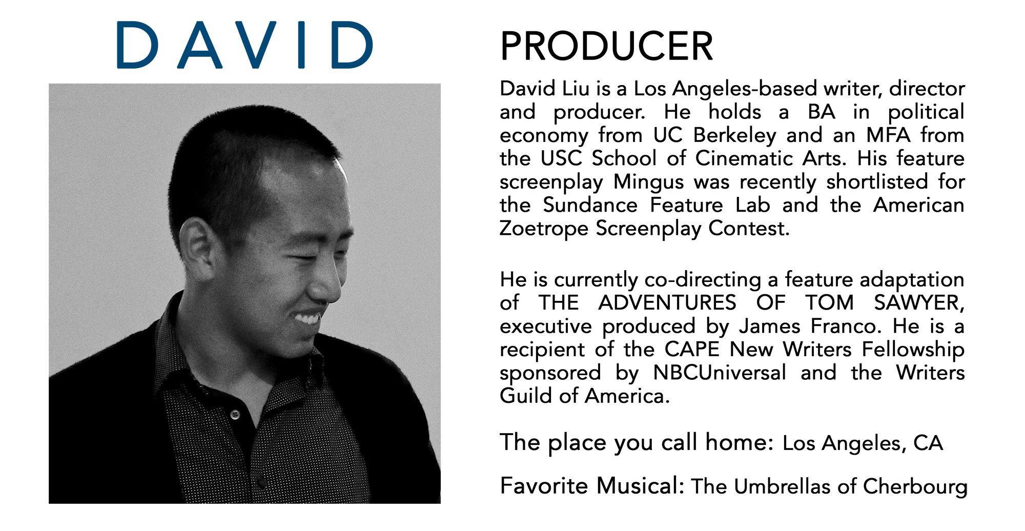 I've realized that the stories I write are very different from the works of my peers purely because I am Asian-American. I think differently, I act differently, and I feel differently. That may seem obvious, but it wasn't to me when I first started. There aren't many films that I relate to or characters that I fully connect with. I find it very important for first-generation Americans to feel accepted and wanted in the world, especially through media. I know that if I saw someone who looked and acted like me, I would feel like I belong in this world. That is why I know it is my calling to direct a feature film. And not just any feature film, but a musical film featuring Asian-Americans. Music is a big part of any culture, and to use music as a character than just a device connects us to memories of our own. It puts us in a certain place at a certain time that it brings us into a story on a deeper level. Like LA LA LAND, the music in our film will be introduced in a natural and organic way than just a soundtrack.
