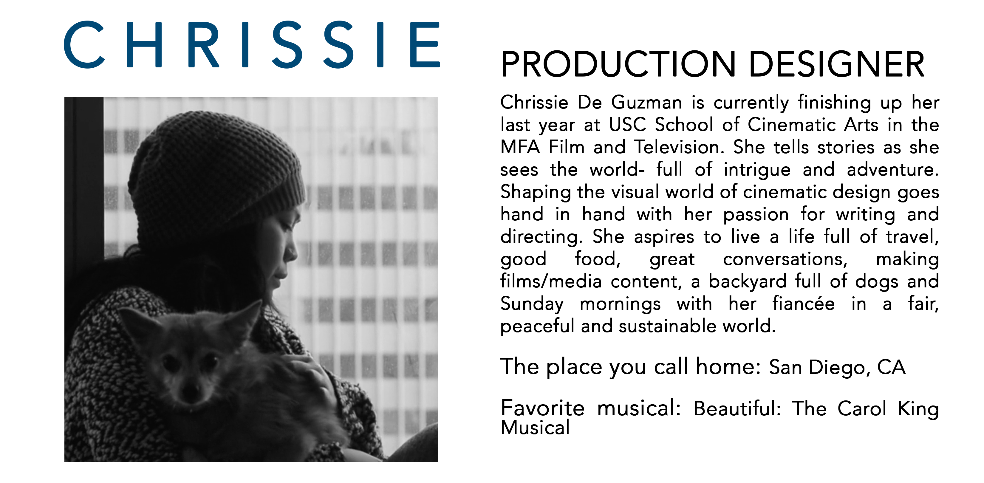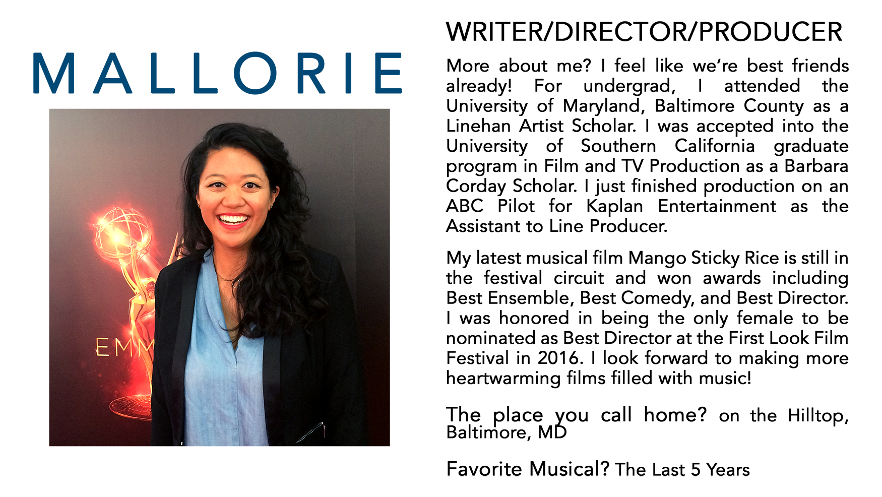 Fast forward to the end of my college career when I realized I hadn't fully immersed myself in the filmmaking world. I took a leap of faith and applied to the #1 film school in the world and was accepted! I've come to learn that a big part of our industry is about luck - and boy have I been incredibly lucky. I am a female Asian-American filmmaker who graduated with an MFA in Film and TV Production from USC. The last three years at USC has been an amazing journey - meeting, creating, and learning from some of the best of the best professors with some of the most inspiring peers. After earning my MFA, I was accepted into the Television Academy Foundation as their Directing Intern, shadowing Emmy-winning directors on shows like Jimmy Kimmel Live, NCIS, Grey's Anatomy, and Hairspray Live. I've been on amazing projects and had some great opportunities come my way, but can't help but feel like there's something bigger calling me. ♫ It calls me♫ (I just sang Moana in my head).