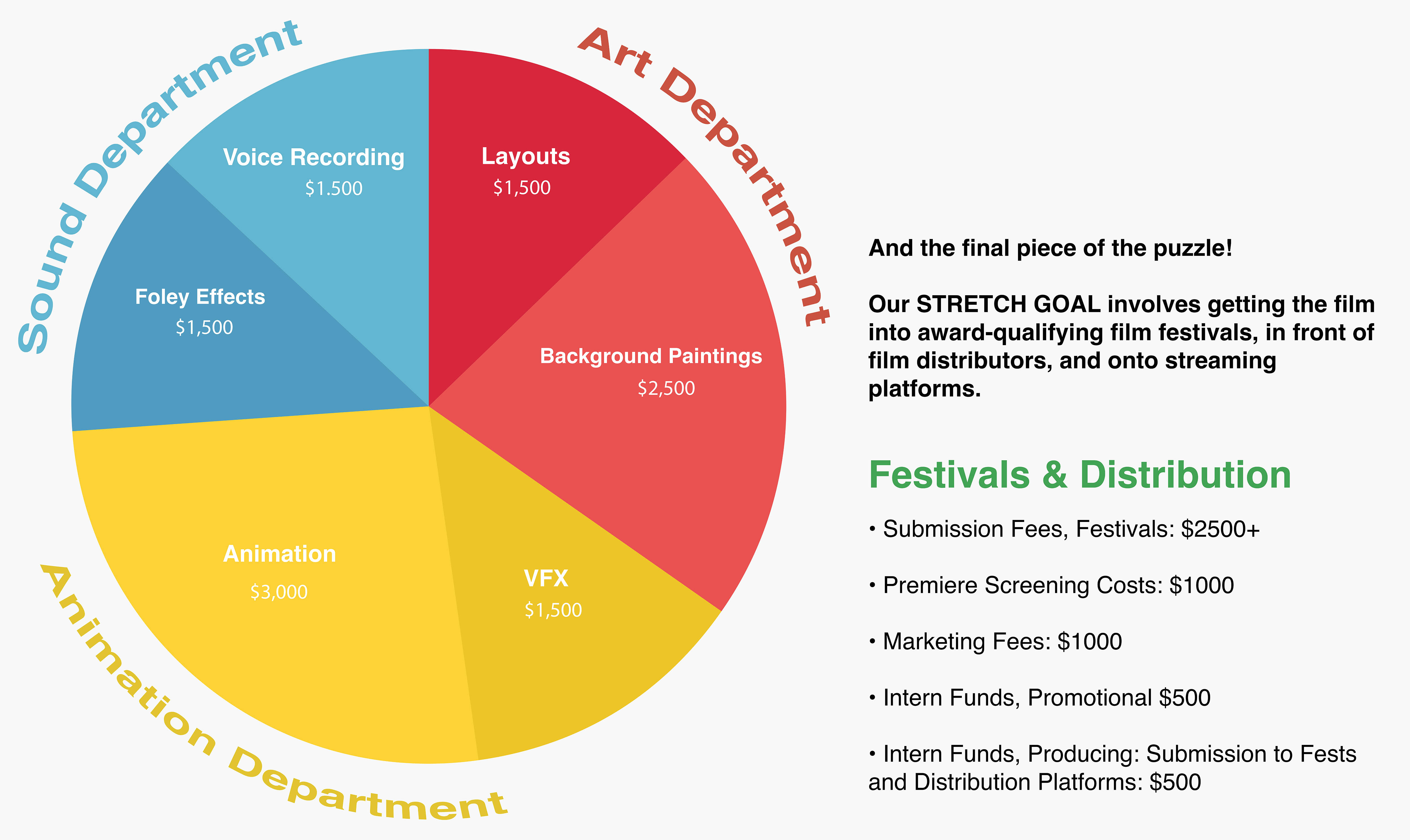 As an animation studio based at a university, we have access to excellent production facilities for our team to learn the ropes. And we have been paying them for their hard work. As part of continuing to compensate these young professionals fairly, we have set a budget for the home stretch. Our target goal is $11,500 to complete the final stages of production, plus a stretch goal of $5,500 to submit to national and international film festivals, negotiate with film distributors, and schedule a private premiere for supporters of the project!
