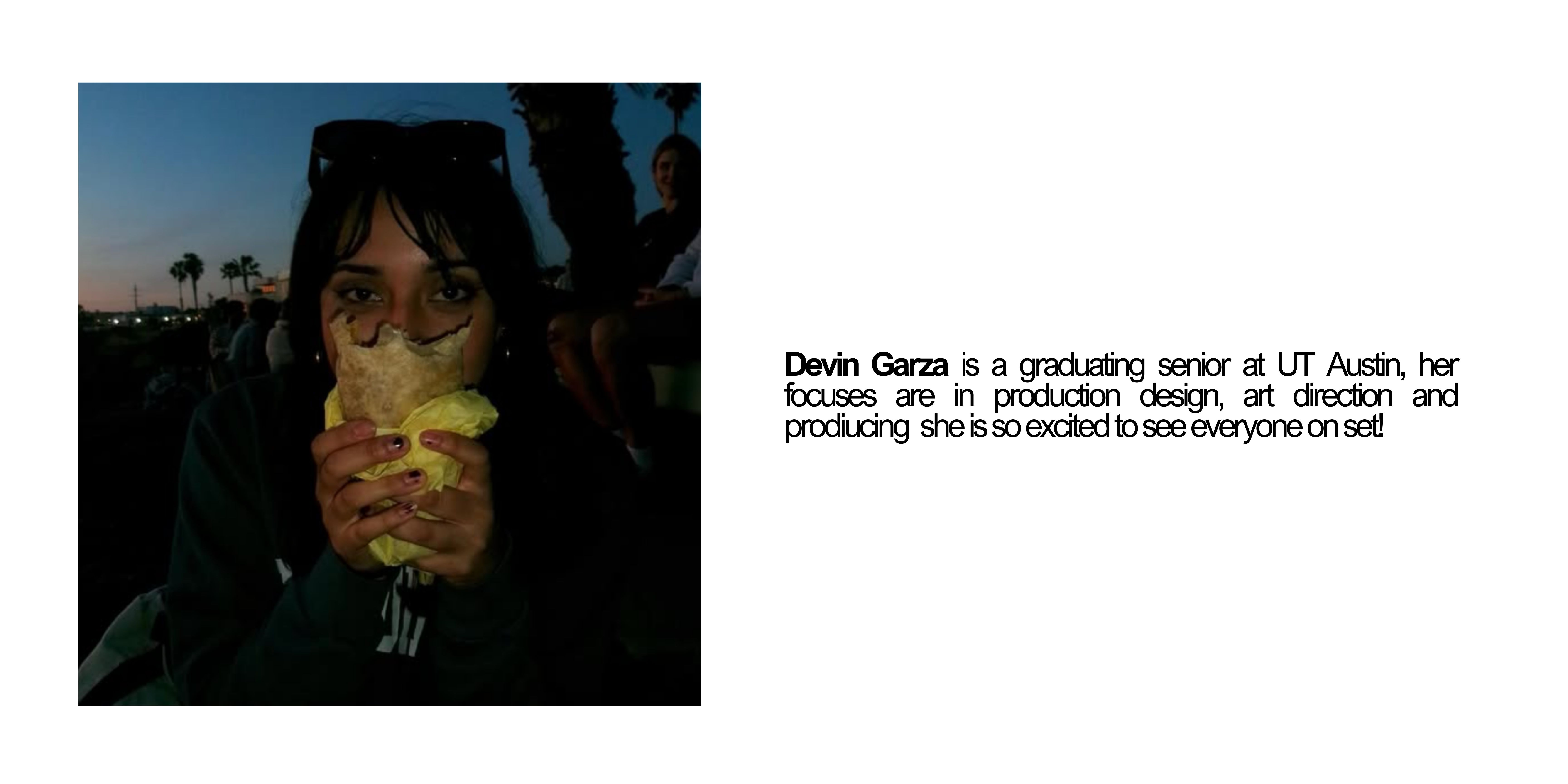 Sofia, Devin, and Sienna are all Radio Television and Film majors at the University of Texas at Austin. Each of them are interested in telling stories that reflect their communities and culture. They each have a unique background in creative endeavors as production designers, directors, and editors. Both Sofia and Devin are graduating seniors and are excited to be working on a thesis and using their voices to uplift their communities and tell stories that are often overlooked. We are very appreciative of this opportunity and appreciate all the help and love we can get to help make this film a reality.