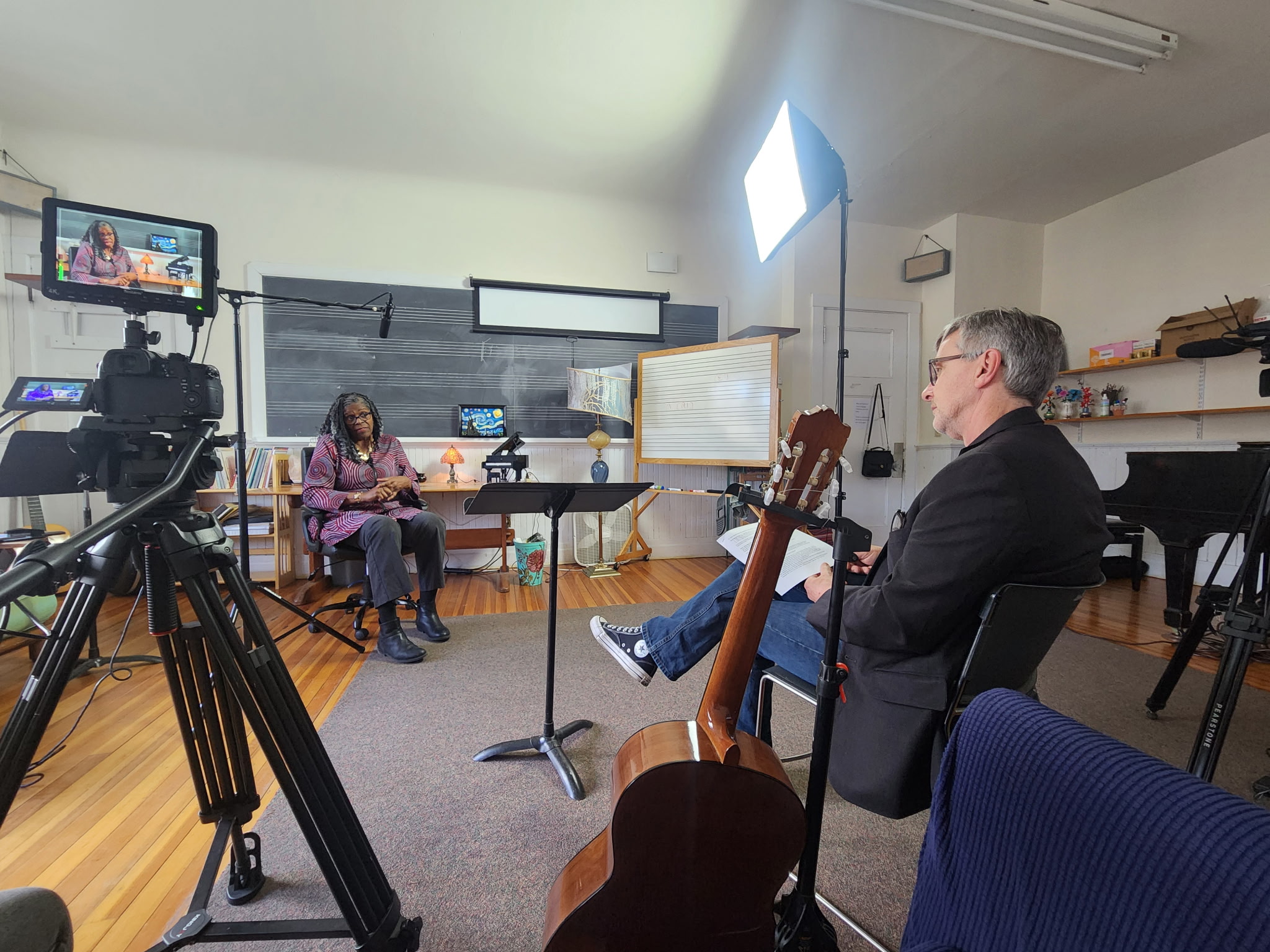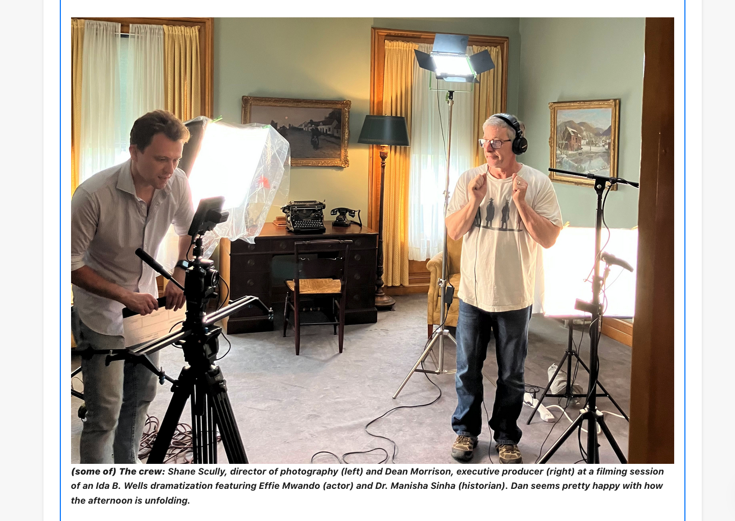 (some of) The crew: Shane Scully, director of photography (left) and Dan Morrison, executive producer (right) at a filming session of an Ida B. Wells dramatization featuring Effie Mwando (actor) and Dr. Manisha Sinha (historian). Dan seems pretty happy with how the afternoon is unfolding. Shane said it is the most fun he has ever had shooting video.
