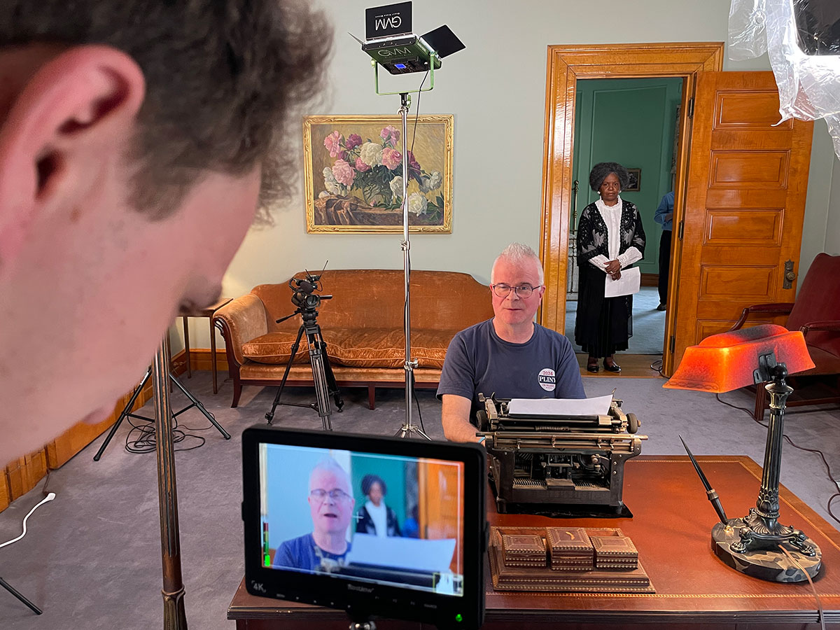 Ida B. Wells filming session. Dr. Manisha Sinha provides historical context as actor Effie Mwando reads an editorial from Ida B. Wells' book "Southern Horrors: Lynch Law in the South."